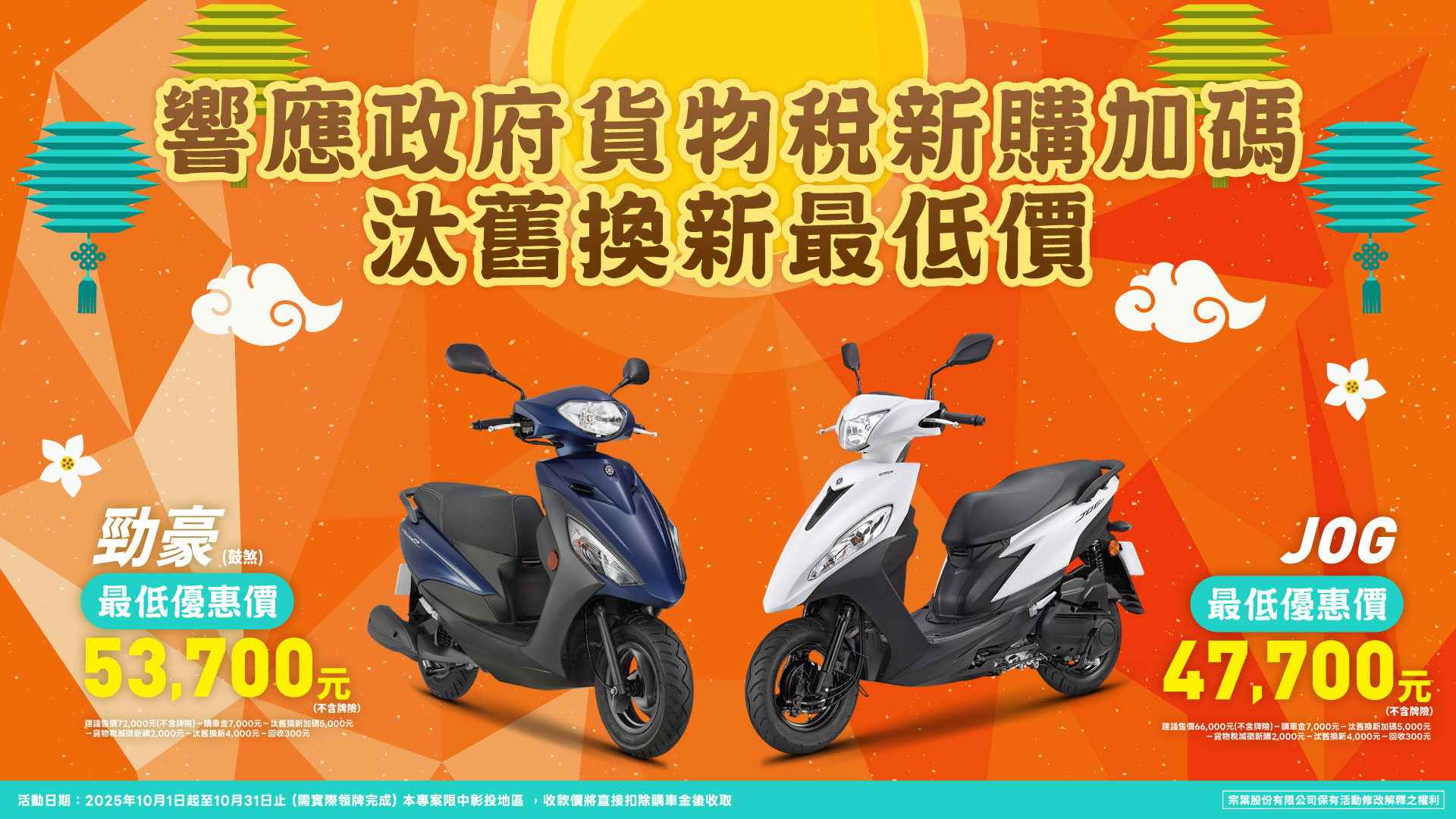 優惠訊息勁豪最低價只要53700元、JOG最低價47,700元(不含牌險) 注意事項: 1.可再結合政府補助,詳情 請點我參閱 2.本專案購車金為直接抵扣,販賣店收款價直接減收購車金之優惠,需親簽購車金簽收單 3.活動僅限於中彰投地區 立即線上零利率購車!