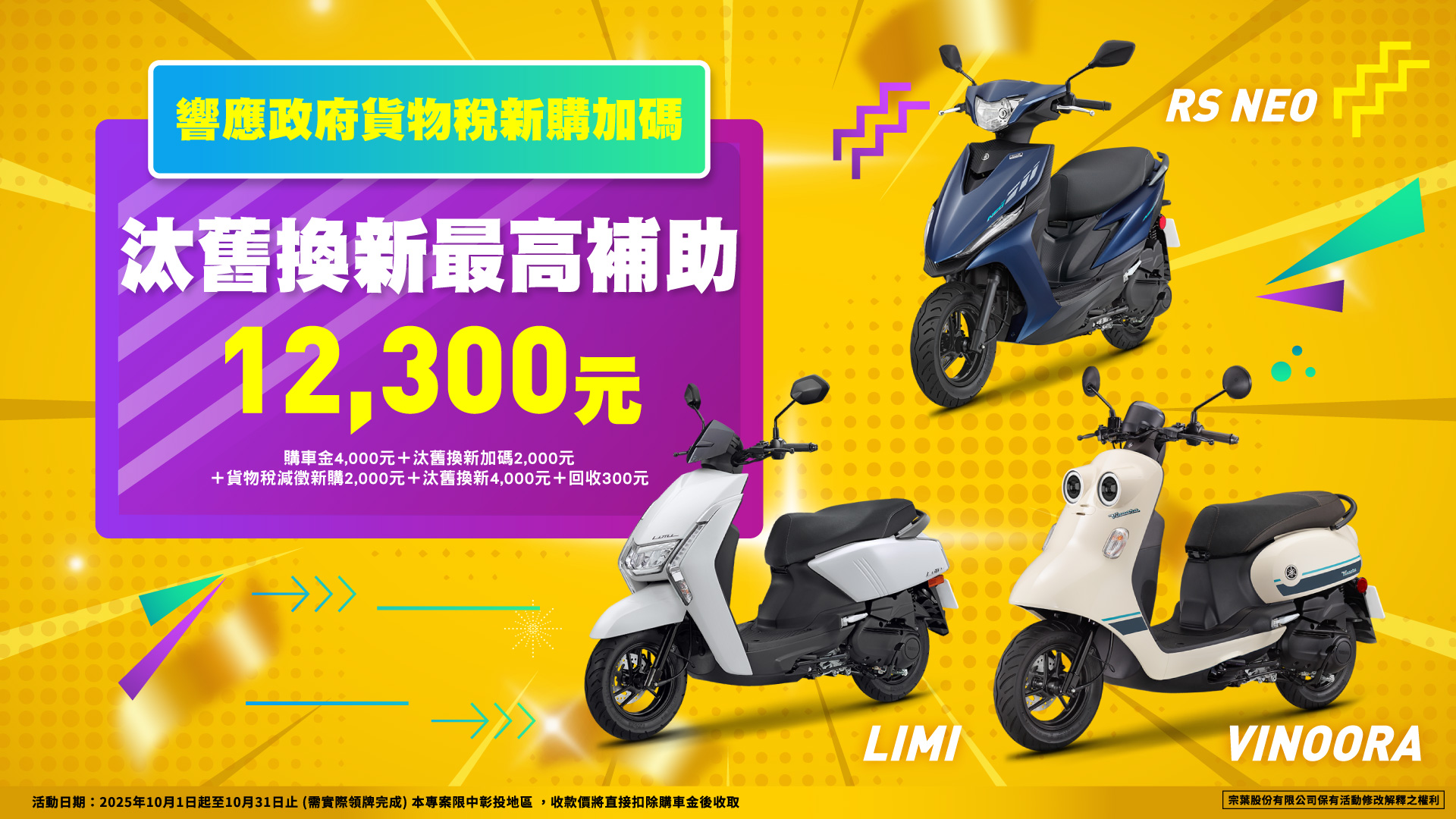 優惠訊息學生購車再加碼 LIMI、VINOORA、RS NEO最高補助12,300元 注意事項: 1.可再結合政府補助,詳情 請點我參閱 2.本專案購車金為直接抵扣,販賣店收款價直接減收購車金之優惠,需親簽購車金簽收單 3.活動僅限於中彰投地區 立即線上零利率購車!