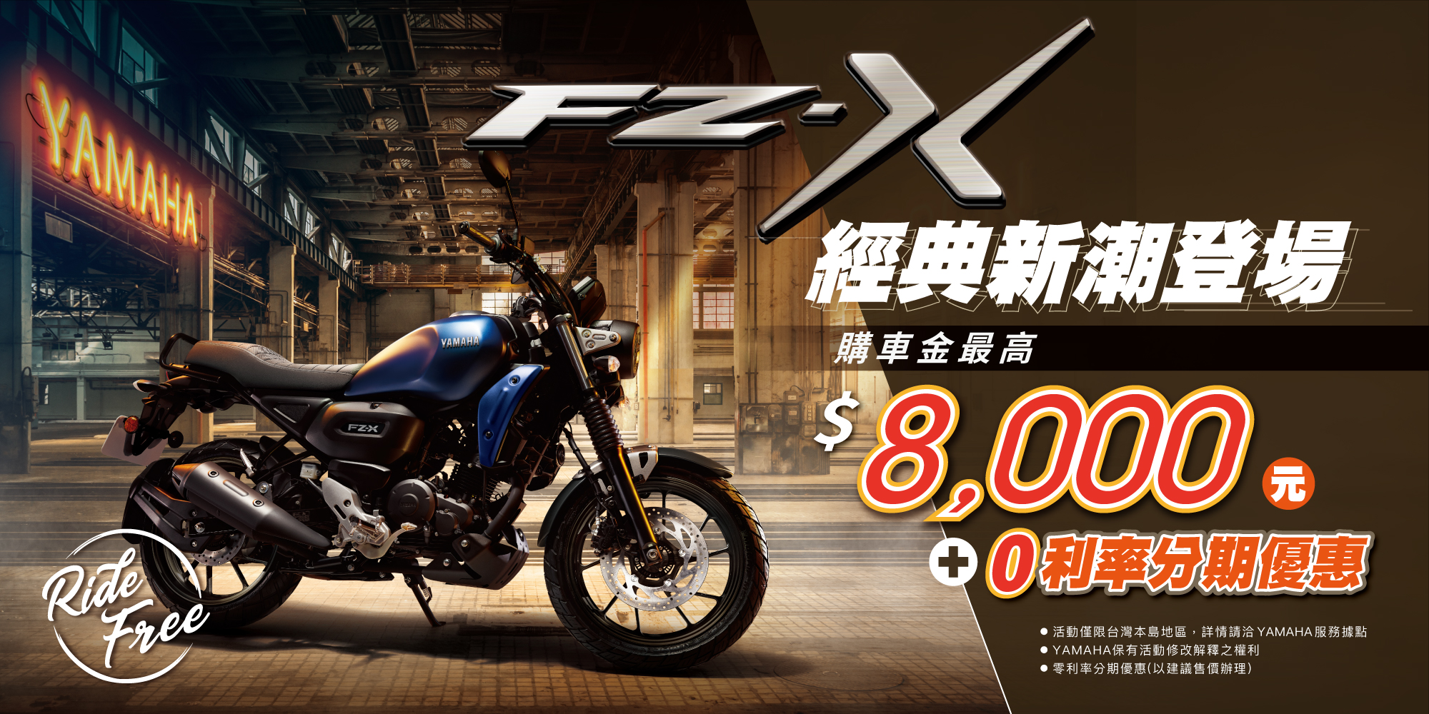 優惠訊息FZ-X購車金8,000元+分期0利率(限114年出廠) 注意事項: 1.可再結合政府補助,詳情 請點我參閱 2.本專案購車金為直接抵扣,販賣店收款價直接減收購車金之優惠,需親簽購車金簽收單 3.活動僅限於中彰投地區 立即線上零利率購車!