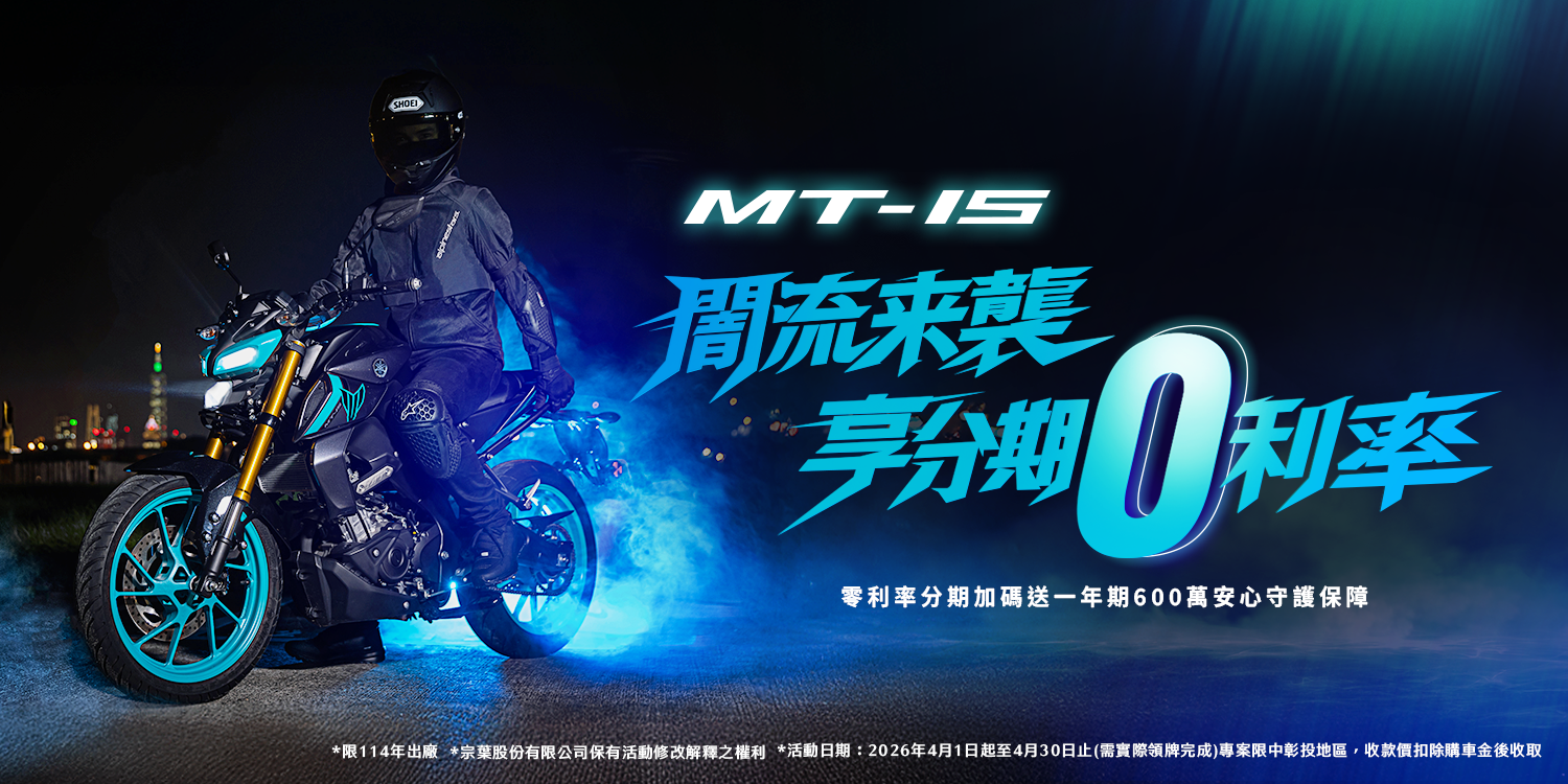 優惠訊息MT-15享分期0利率(限114年出廠) 注意事項: 1.可再結合政府補助,詳情 請點我參閱 2.本專案購車金為直接抵扣,販賣店收款價直接減收購車金之優惠,需親簽購車金簽收單 3.活動僅限於中彰投地區 立即線上零利率購車!